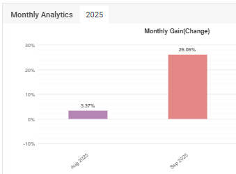 El mes de septiembre ha sido un periodo excepcional para nuestra cartera de robots de trading, con un rendimiento acumulado del +26,06%, bajo un nivel de riesgo 3/5 (medio). Un resultado que no solo resalta por su magnitud, sino por la solidez con la que se construyó: 122 operaciones ejecutadas de manera automatizada, con un 77,8% de los sistemas cerrando en positivo.